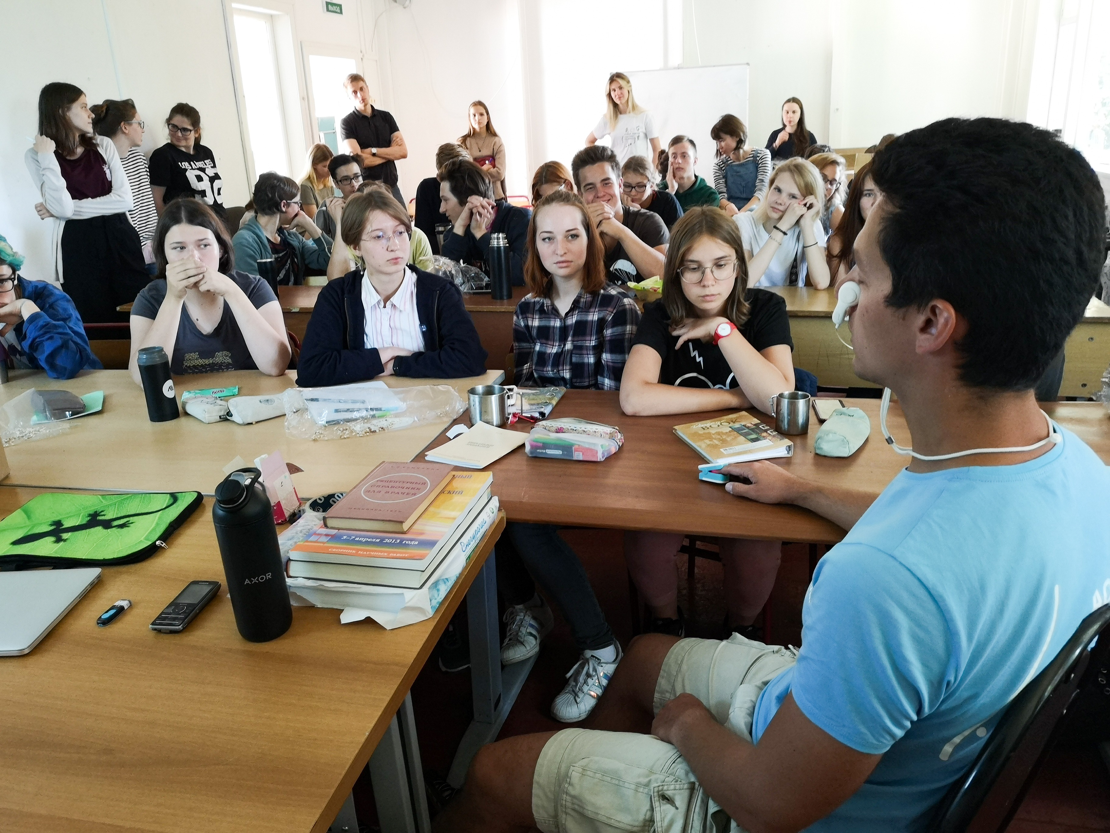Мила Бодиловская, Ирина Зеленкова и Константин Борисов выступали перед медицинским отделением с презентацией «Мифы о фридайвинге». Дети впечатляюще много знают о человеческом теле и его системах и легко понимают физиологию фридайвинга. Ирина Зеленкова рассказывала о влиянии тренировок на здоровье и спортивную форму, ссылаясь на исследования и упоминая авторов. Было приятно видеть, как дети 14-16 лет требовательно относятся к источникам информации, которую им предлагают. Им очень понравился мягкий подход, который практикуется в тренировках фридайверов: внимательность к себе, реалистичное отношение к своему телу и понимание своих ограничений, которые удается постепенно отодвигать разумно построенной тренировкой.